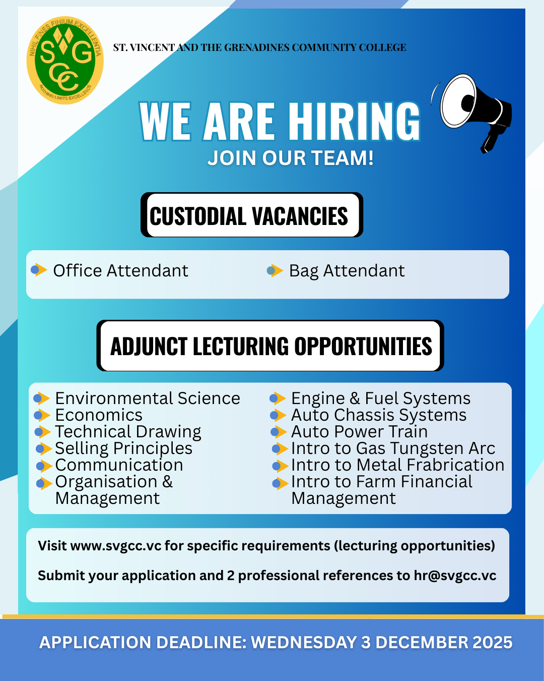 2. Submit your application via email to hr@svgcc.vc, with the subject title – Job Application: (Position being applied for). E.g. – Job Application: (Lecturer, Sociology).
