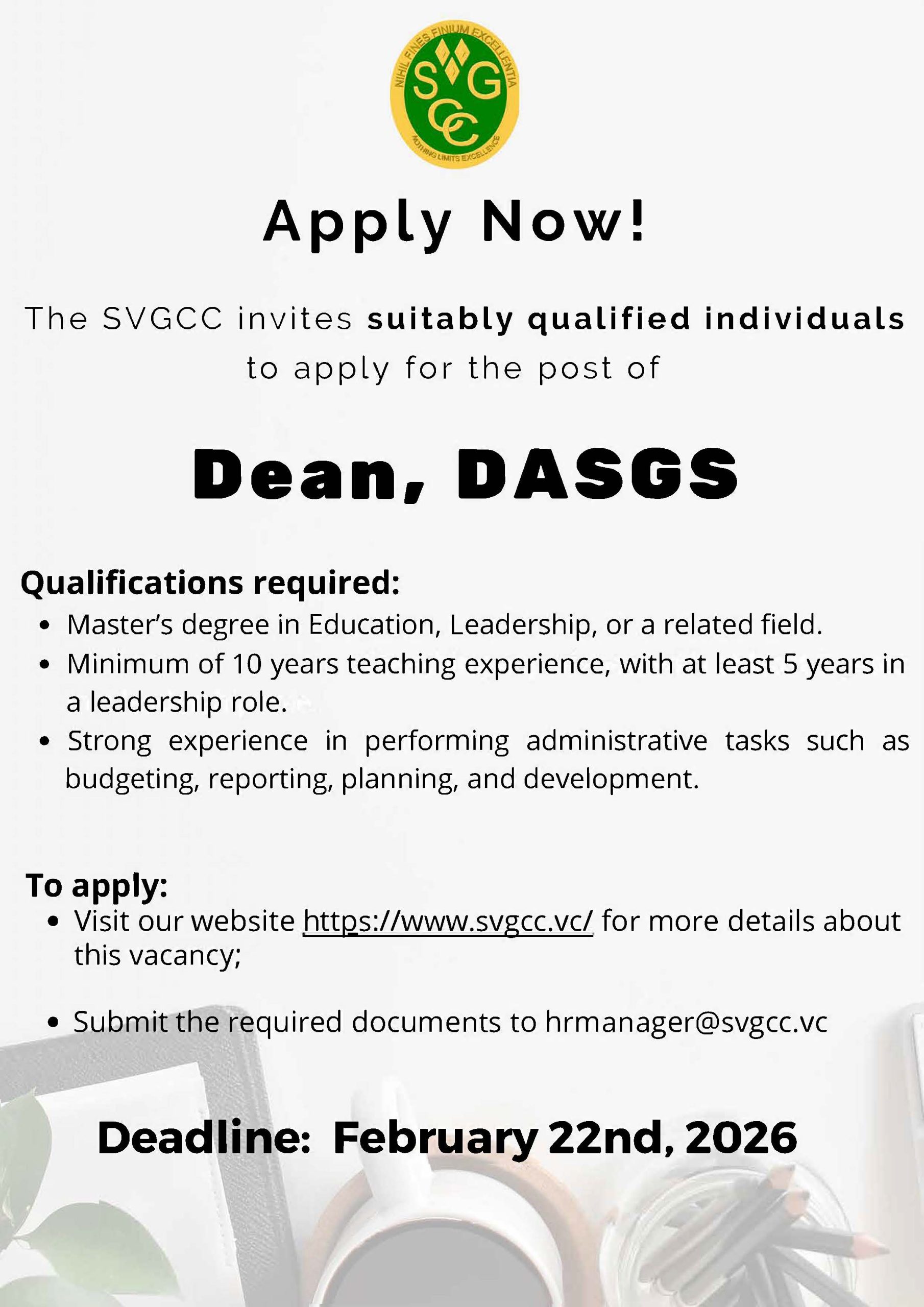 Applications are invited from suitably qualified individuals for the post of Dean of the Division of Arts, Sciences, and General Studies (DASGS) of the St. Vincent and the Grenadines Community College (SVGCC).