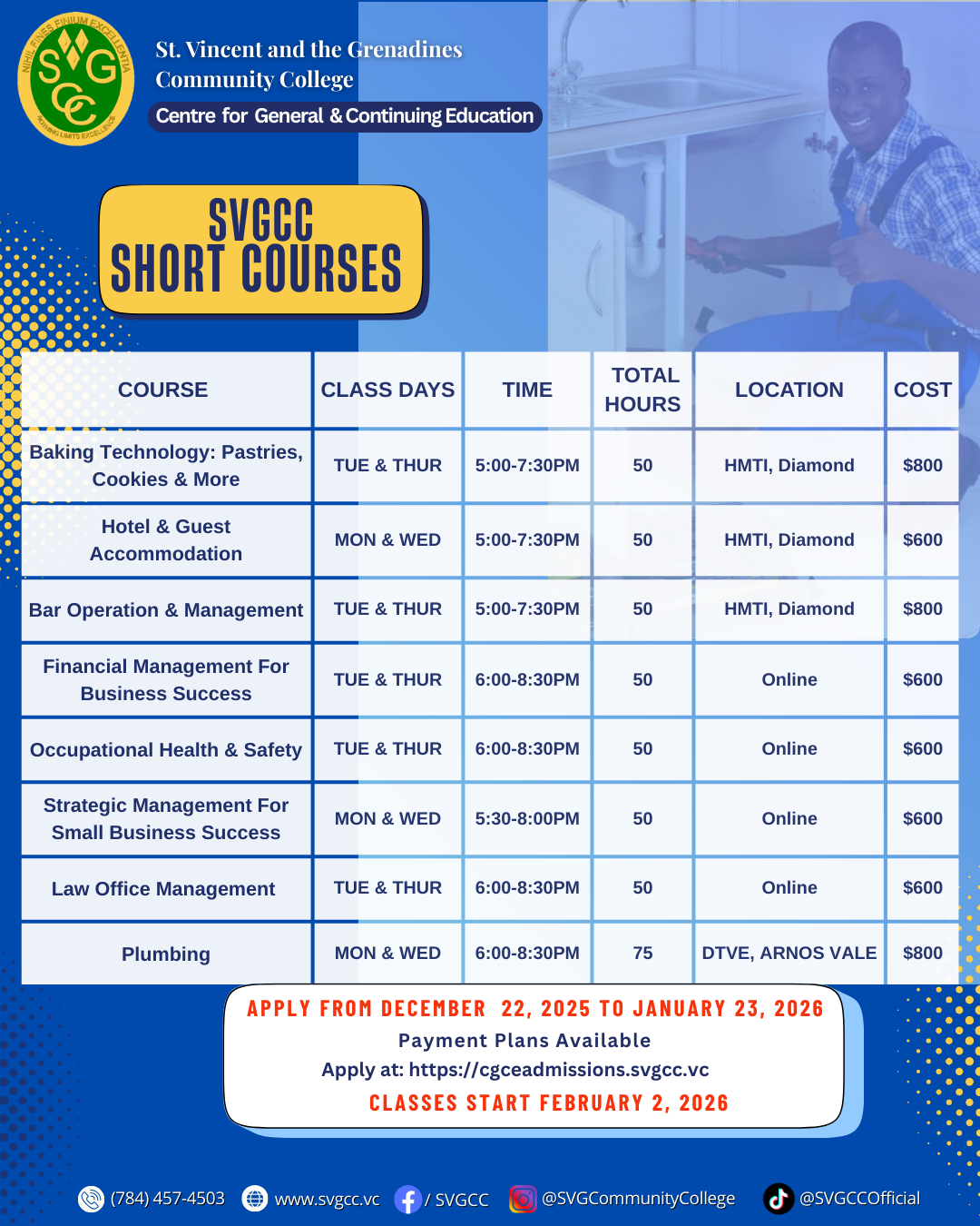The St. Vincent and the Grenadines Community College (SVGCC) welcomes applications for the February 2026 cycle of Short Courses. These courses are designed to provide practical, industry-relevant skills for individuals seeking professional development, career advancement, or personal enrichment. This cycle’s …