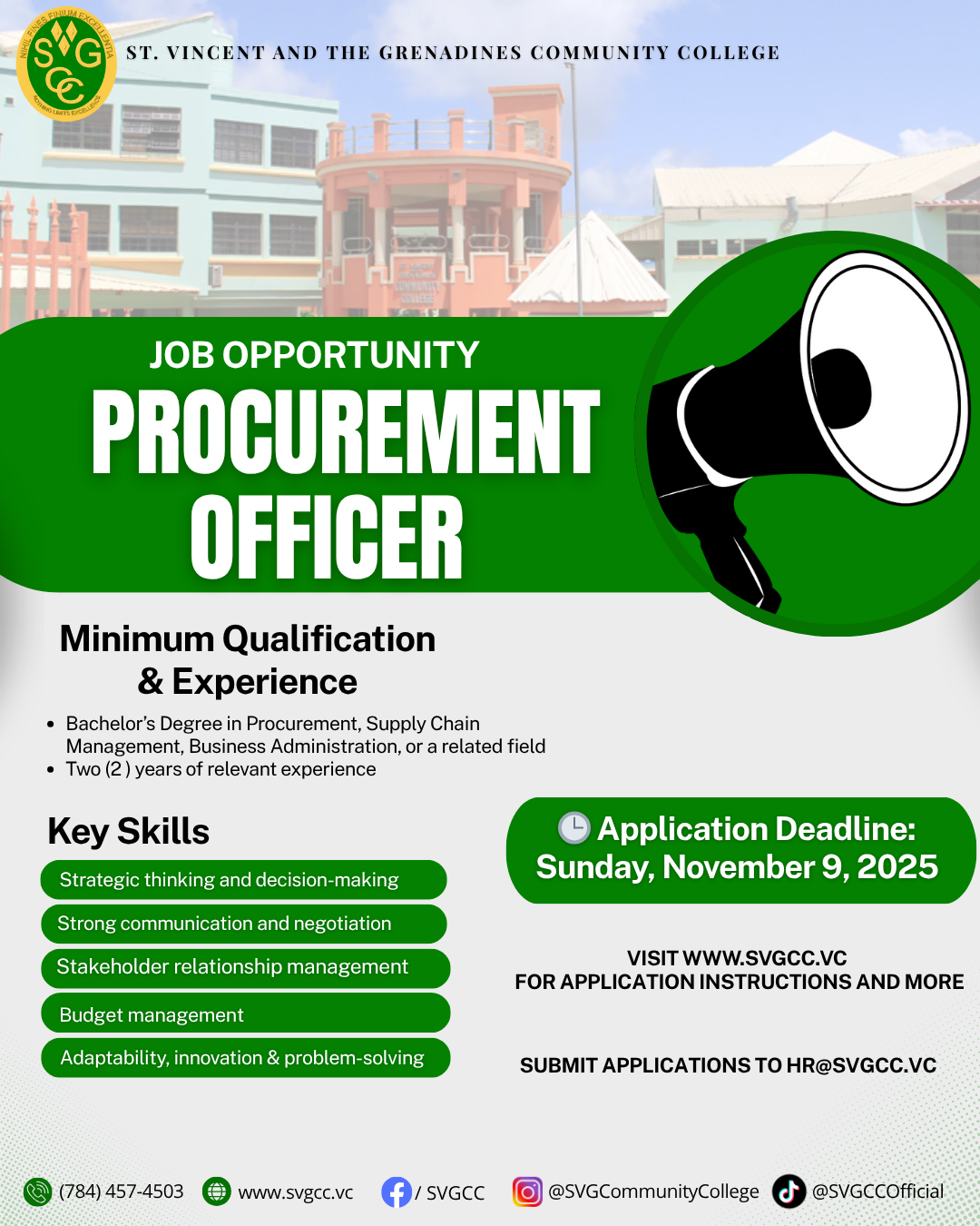 Applications are invited from suitably qualified individuals for the post of Procurement Officer within the Finance Department of the Saint Vincent and the Grenadines Community College (SVGCC). SUMMARY OF DUTIES & RESPONSIBILITIES: The role of Procurement Officer includes but is …